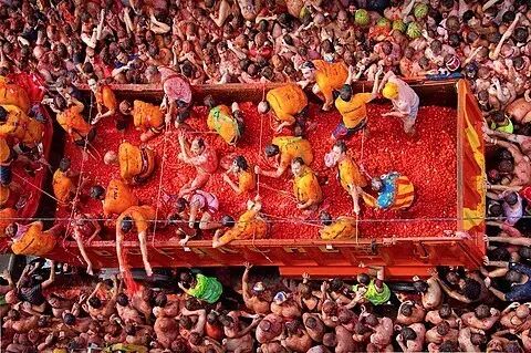 西班牙拥有世界上最大的食物大战:番茄大战(La Tomatina)!每年八月的最后一个星期三在瓦伦西亚的布尼奧尔镇(Buñol)举行。说实在的,我真的很想找一张很具有美感的照片,但是,真的...找...不...到...